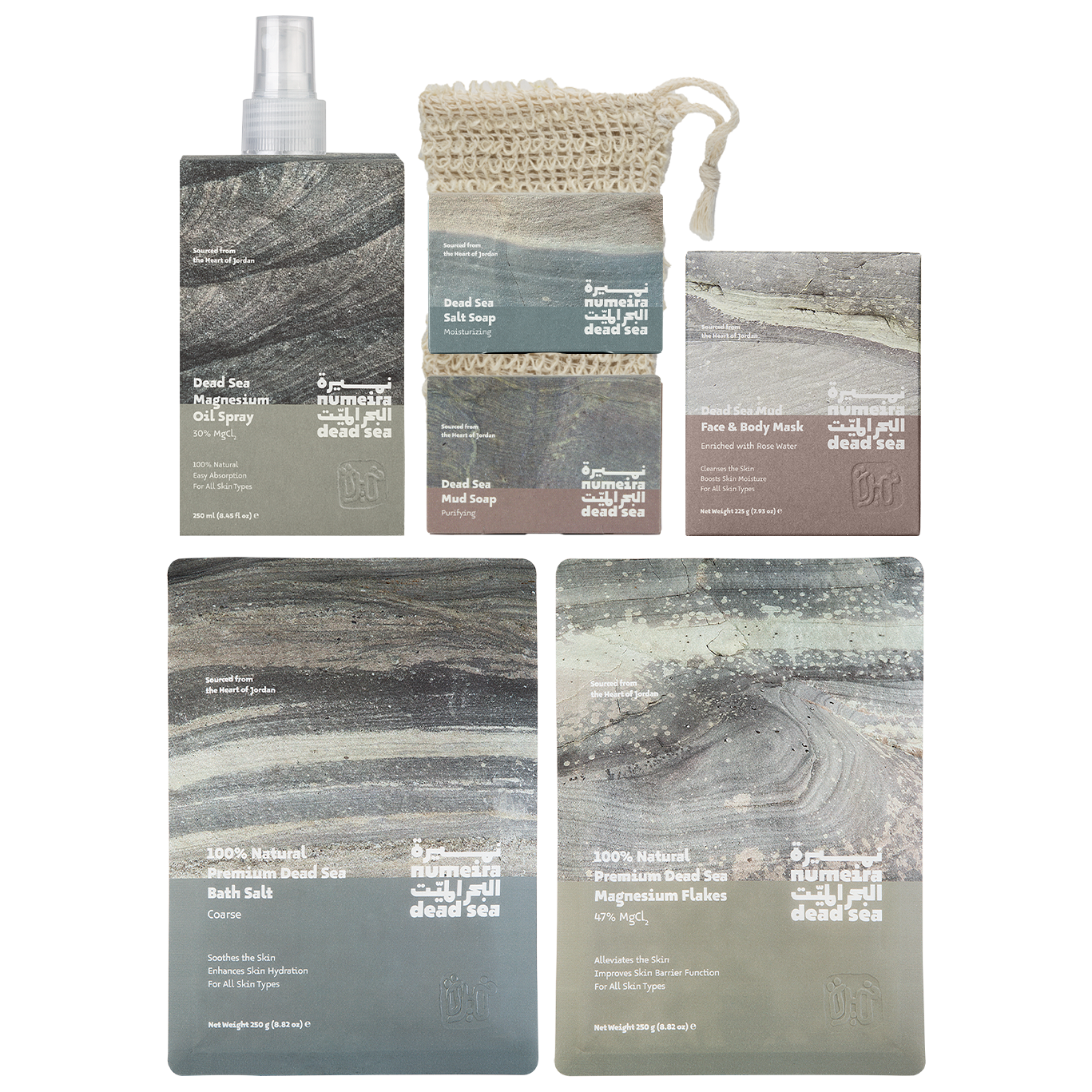 Das Numeira Dead Sea Geschenkset ist elegant verpackt und verkörpert die atemberaubende natürliche Schönheit des Toten Meeres. Jedes Produkt wurde sorgfältig entwickelt, um ein authentisches Erlebnis zu bieten, das die zeitlose Schönheit und heilenden Eigenschaften der Wunder unseres levantinischen Landes und nomadischen Erbes feiert.
